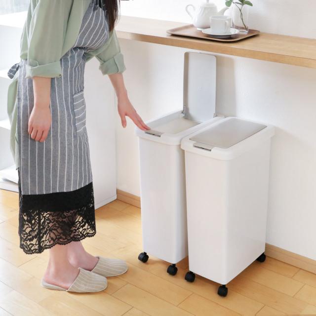 複数並べて可燃ごみと不燃ゴミの分別用ゴミ箱として利用したり、ふたを開けた時の高さは84cmなのでカウンター下に設置にもおすすめです。また、ふた付きなので中身が見えず、角型の形状がどこでも設置やすい使い勝手のいいゴミ箱です。
