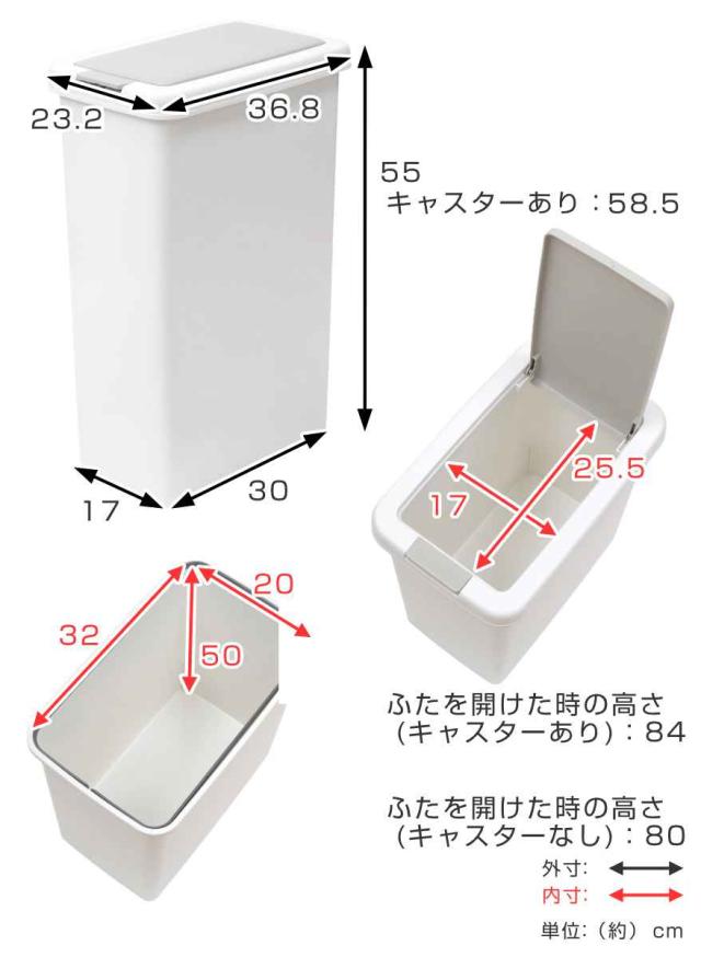 | サイズ | 約 幅23.2×奥行36.8×高さ58.5(cm) ふた開けている時の高さ:約85cm キャスター無しの高さ:約 55(cm) |