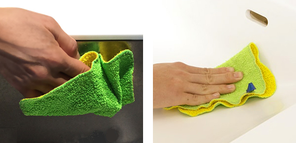 アクリルハード面は、樹脂加工仕上げで汚れをしっかり吸着します。アクリルソフト面は、浴室小物など、傷つきやすい物の掃除に適しています。洗剤不要な上、指先感覚で掃除ができます。