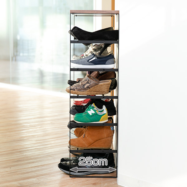 奥行き25cmとスリムなので、限られたスペースの玄関でも、空間を圧迫せずにたくさんの靴を収納できます。扉や壁がないので通気性も良く、湿気やニオイがこもりません。