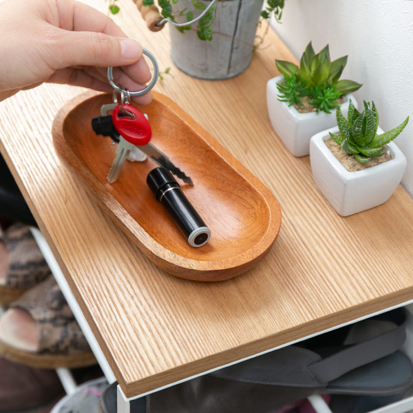 鍵や印鑑を置いておくのに便利な天板が付いています。ディスプレイスペースとして植物を飾ったり、カバンの一時置きとしても使えます。