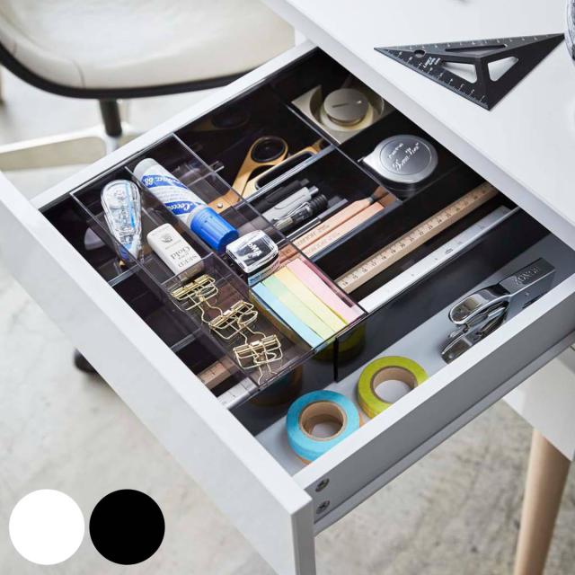 伸縮できるので、引き出しの奥行きに合わせてサイズを変更できます。仕切るための小さいトレイもあるから、使う文具に合わせて外すこともできます。