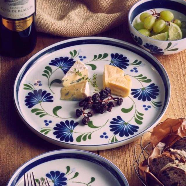 白地に鮮やかなブルーとグリーンが映え、食卓を上品に飾ります。どっしりとした安定感と程よい厚みが高級感を漂わせています。