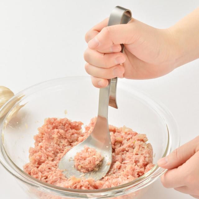 手のようにこねる・混ぜる・すくうがこれ一本でできます。手がベタベタになったり、冷たい思いをしなくていいので、ハンバーグやロールキャベツ、肉団子などのひき肉料理が手軽に作れます。指の間からにゅっと出てくるような大きな穴形状は肉が詰まらずスムーズにこねることができます。