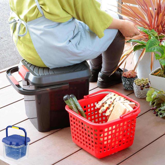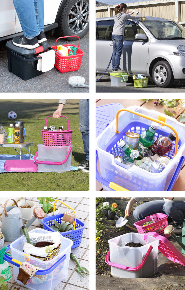 洗車、レジャー、スポーツ、ガーデニング、屋内掃除など、様々なシーンに対応できます。バケツとして使うだけでなく、丈夫な蓋を活かして乗ったり座ったりできるスツールとして使ったり、中カゴは取り外しが可能なので水切りカゴや収納ボックスとしても便利に使えます。