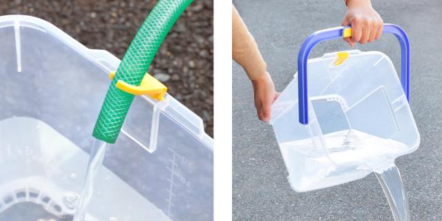 | ホースもしっかり固定 バケツにはホースを固定しておけるリングがついています。 | 注ぎやすい口 四角いボディでも注ぎやすい形状です。 |