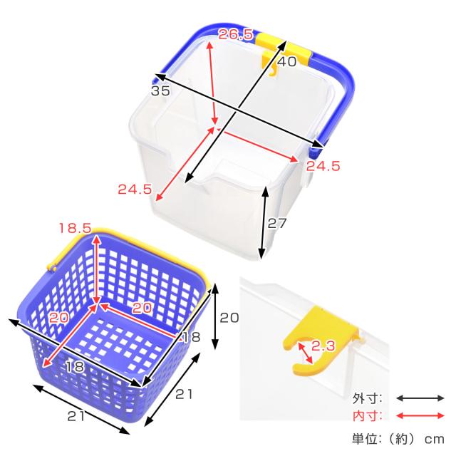 | サイズ | 約 幅35×奥行34.5×高さ29.5(cm) 【バケツ】 外寸:約 幅35×奥行34.5×高さ29.5(cm) 内寸(上部):約 幅29.2×奥行31.7×高さ26(cm) 内寸(下部):約 幅25×奥行25×高さ26(cm) 【内カゴ】 外寸:約 幅27.7×奥行27.7×高さ19.5(cm) |