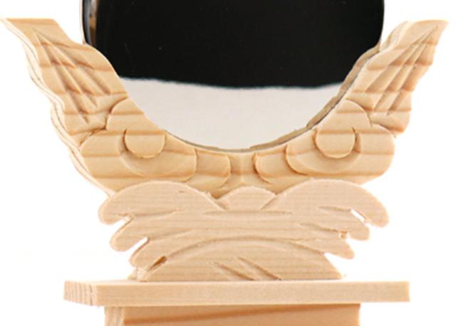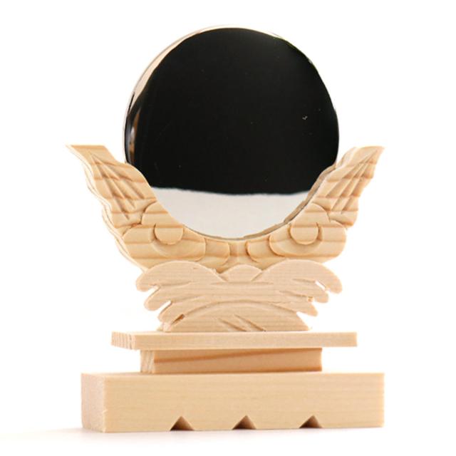 台座は白木に細微の彫りを施した立体的なデザインです。造りの良い神鏡をお探しの方にお勧めです。