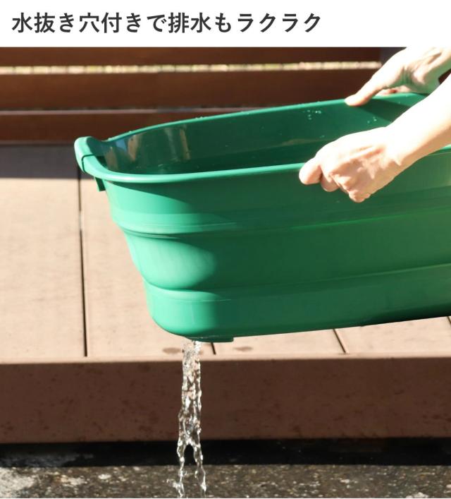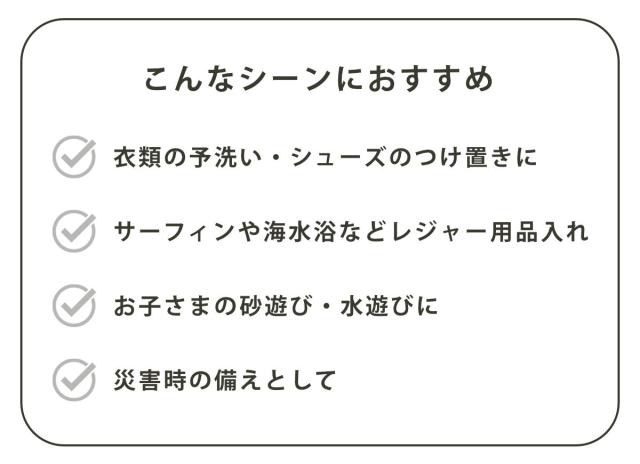 手洗いやつけ置き洗いはもちろん、暮らしのあらゆる場面で活躍します。アウトドアでドリンクを冷やしたり、お子さまのおもちゃ入れ、玄関・ベランダの掃除道具入れなど使い方は自由自在。丈夫で柔らかい素材なので、お子様やペットにも優しく、扱いやすい万能アイテムです。