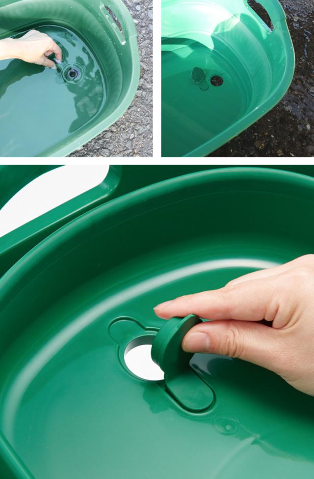 底の栓を外すことで簡単に水抜きが行えます。中身は入ったままで水だけ抜きたい時や、ほったらかしにしていても水抜きができるので便利です。また、片側だけ折りたたんで高さを低くすることで、水を一気に捨てることができます。