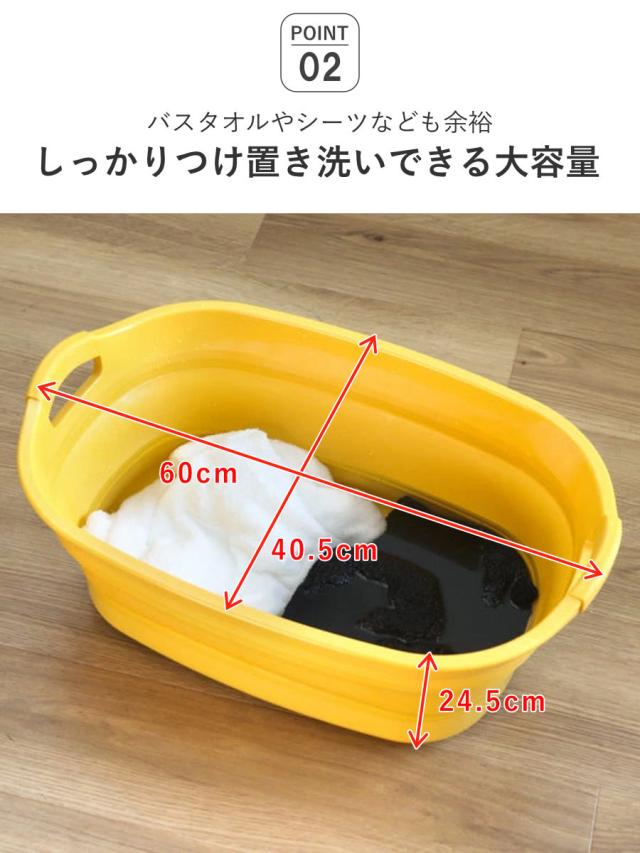 バスタオルやシーツなどの大きなものもゆったりつけ置きできるたっぷりサイズです。大人の靴が2足入る広さで、手洗いもスムーズに行えます。幅が約60cmあるので、ペットのシャンプーにもおすすめです。