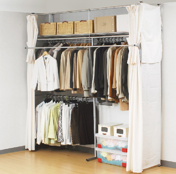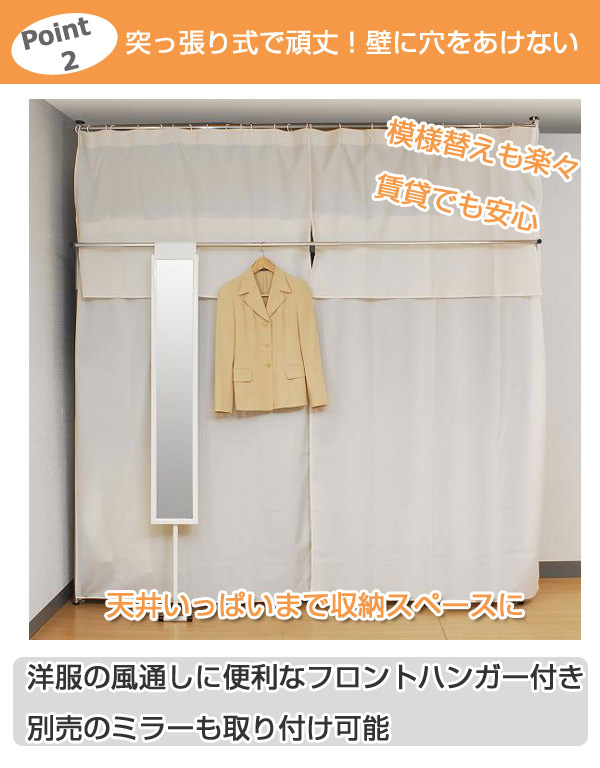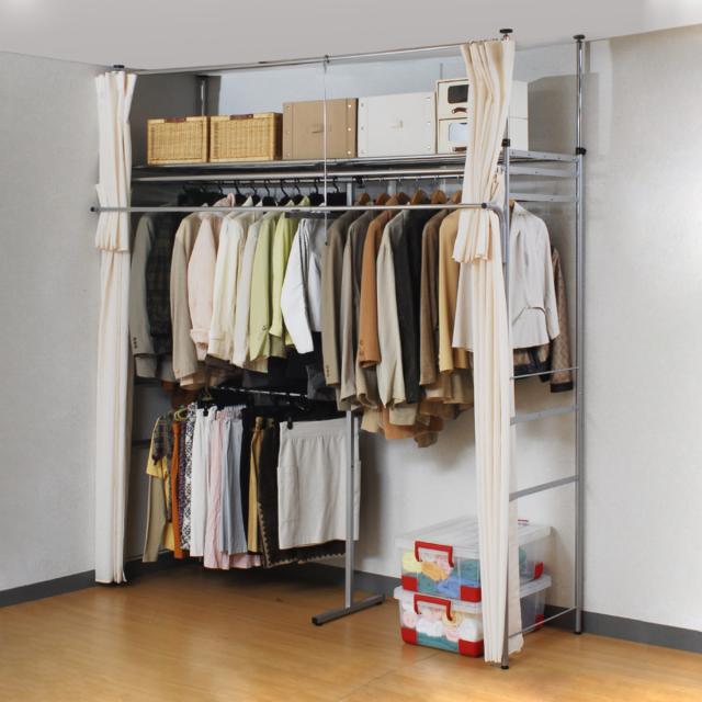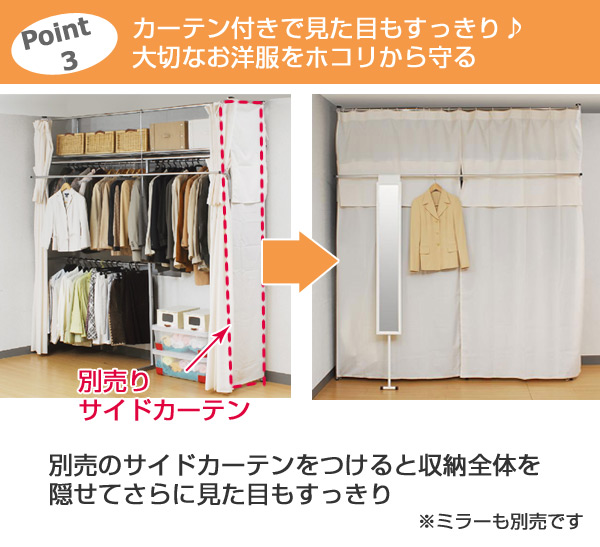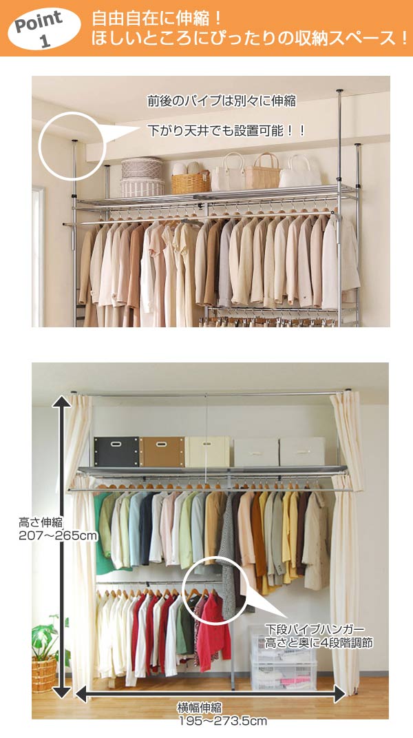 突っ張り クローゼット ハンガーラック SK フロントハンガー・カーテン付 幅195〜273cm ( つっぱり 伸縮 突張り ラック 壁面収納 収納 スチール シルバー 吊り下げ収納 ハンガー 棚 収納ラック 衣類収納 )