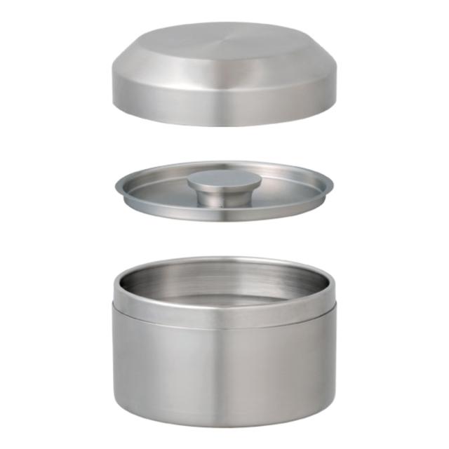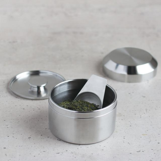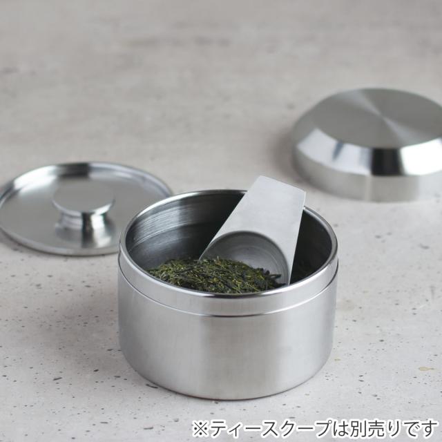 遮光性があり、密閉性が高いステンレス製のキャニスターです。外蓋と内蓋の二重蓋で茶葉の保存に適しています。