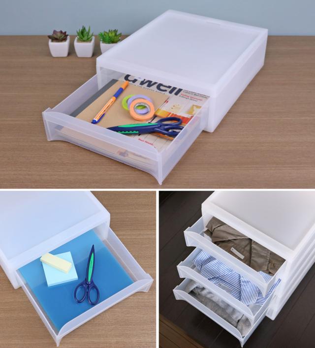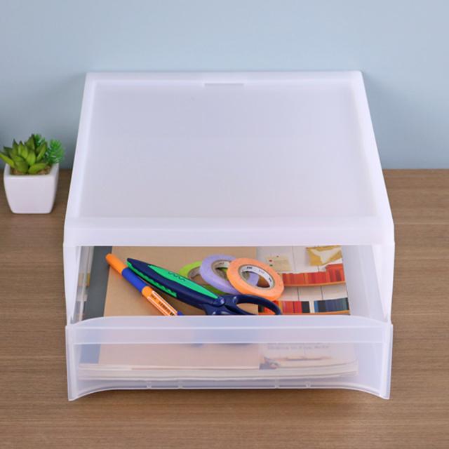A4クリアファイルが入るサイズで、文具などをまとめて収納できるので、デスク整理に最適な引き出し収納ケースです。文具だけでなく、しわになりやすいシャツやYシャツを一枚ずつ収納するのに使うのもおすすめです。無駄のないシンプルなデザインで、どんな空間にも馴染みやすく、使いやすい収納アイテムです。