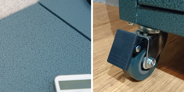 | ハンマートーン仕上げ 表面をハンマーで叩いて、凹凸のある模様を付けたハンマートーン仕上げが無骨な雰囲気を演出します。 | キャスター付きで移動が簡単 移動に便利なキャスター付きで、模様替えやお掃除の時にも楽ちん。ストッパーが付いているので、動かす必要のない時には固定しておけます。 |