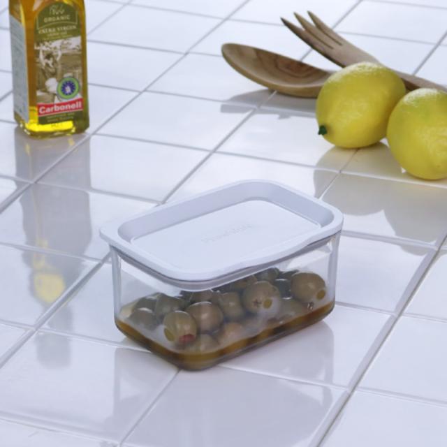 グローバルデザインのフレッシュロックコンテナは、凸凹の少ないシンプルなフォルムです、洗いやすくガラスのような美しい透明感のある本体と白いフタの組み合わせはキッチンと冷蔵庫を清潔感あふれる空間へ導きます。