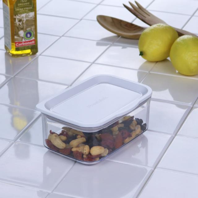 グローバルデザインのフレッシュロックコンテナは、凸凹の少ないシンプルなフォルムです、洗いやすくガラスのような美しい透明感のある本体と白いフタの組み合わせはキッチンと冷蔵庫を清潔感あふれる空間へ導きます。