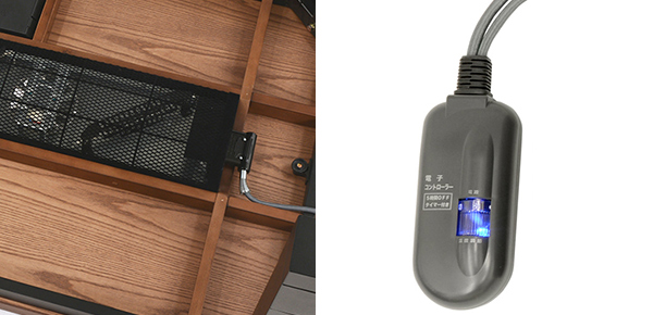 | 高性能のカーボンヒーター ヒーターは速暖性に優れ、すぐにぽかぽか暖かくなります。※5時間経つと自動で電源が切れるので安全です。 | 手の届く範囲で操作 手元に置いておけるコントローラーが付いています。その場から動かずこたつの温度調節ができるので便利です。 |
