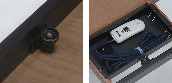 | ネジを固定して天板ずれ防止 天板が動かないようネジを締めて固定できます。※布団使用時は固定不可です。 | 未使用時のコードを大切に保管 天板を外した本体には、コードを収納できるボックスがあります。 |