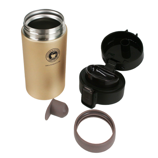 | 材質 | 本体:ステンレス鋼(アクリル樹脂塗装) 飲み口・蓋・蓋本体:ポリプロピレン ロックレバー:ABS樹脂 ストッパー:ポリアセタール バネ・軸:ステンレス鋼 蓋パッキン・飲み口パッキン:シリコーンゴム |
