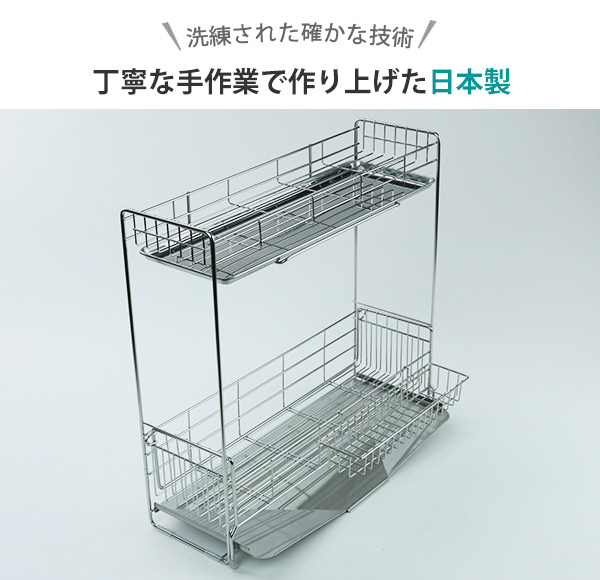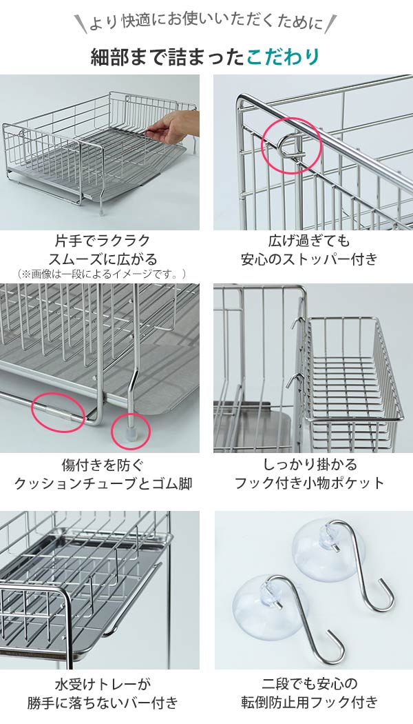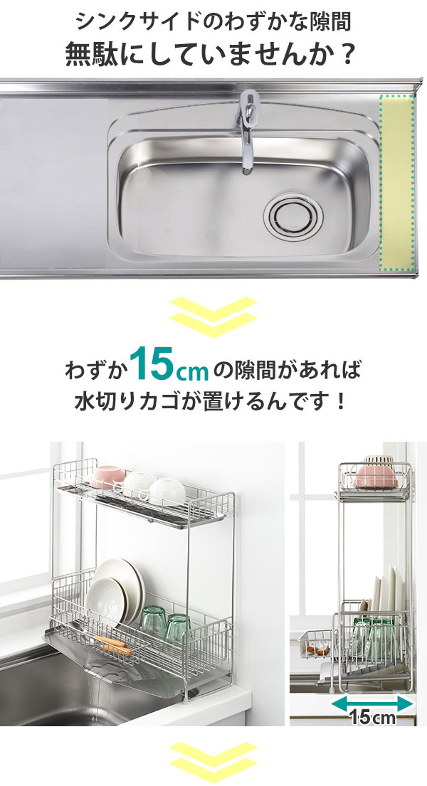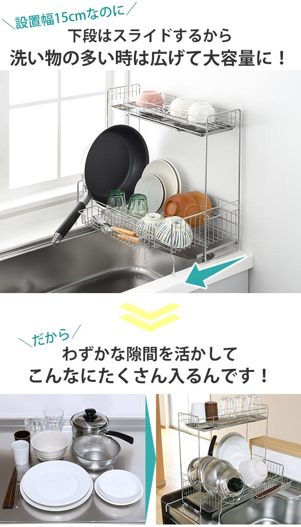 水切りラック シンクサイド 幅の広がる2段水切り 幅15cm×奥行47cm ( 日本製 ステンレス カトラリーポケット付き シンク上 スリム 2段 伸縮 水切りかご 水切り 大容量 水切りカゴ ステンレス水切り 水切りバスケット 水が流れる )