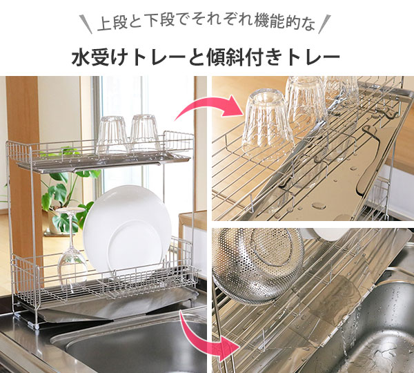 上段のトレーは皿タイプなので下段の食器に水がかからないよう水滴をしっかりキャッチ。下段のトレーは、食器から落ちた水が中央に集まり直接シンクに排水してくれる傾斜付きなので、面倒な水捨てが不要でいつも清潔な状態でお使いいただけます。