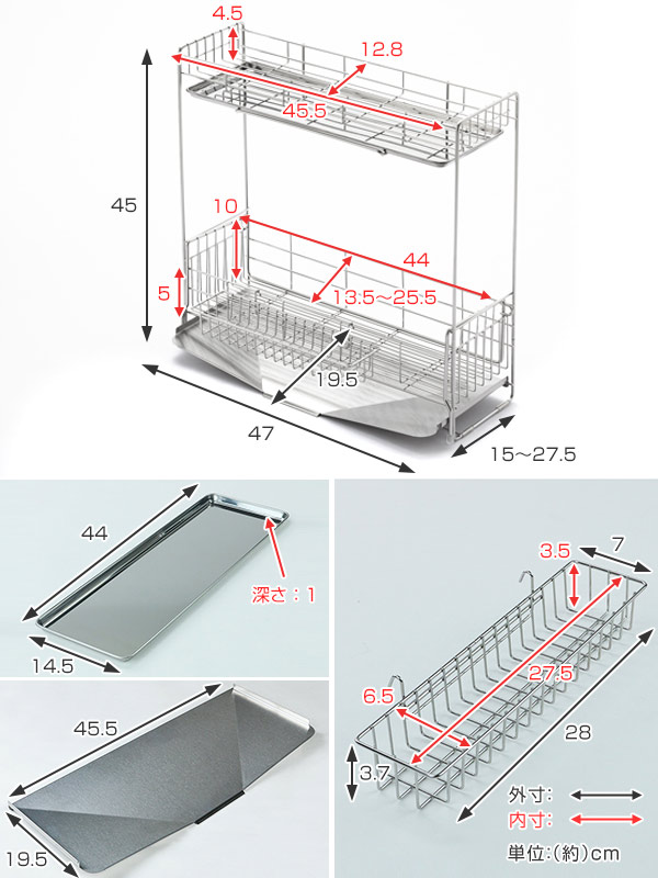 | 材質 | 本体・小物ポケット:18-8ステンレス 上下段トレー:18-0ステンレス クッションチューブ・脚ゴム:シリコーンゴム 吸盤:塩化ビニール |