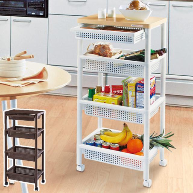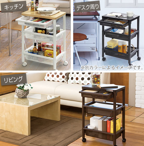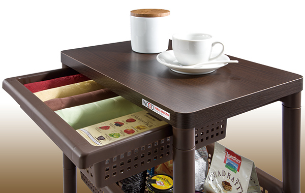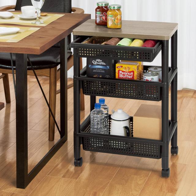 本体はプラスチック製で軽量ですが、天板は木製のため安定して物が置け、インテリアにも馴染みやすいです。天板下の引き出しは、カトラリーやクロスなどちょっとした小物収納に便利です。