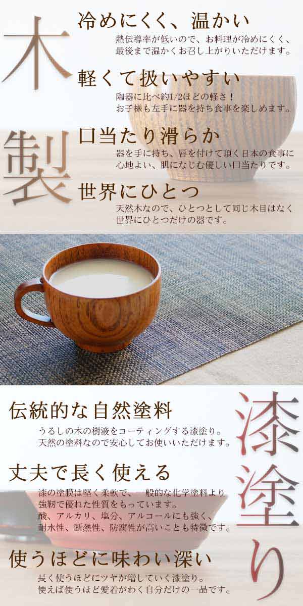●木製の器は熱の伝導率が低いので、表面が熱くなりにくく、尚且つ飲み物の温かさをキープしてくれます。