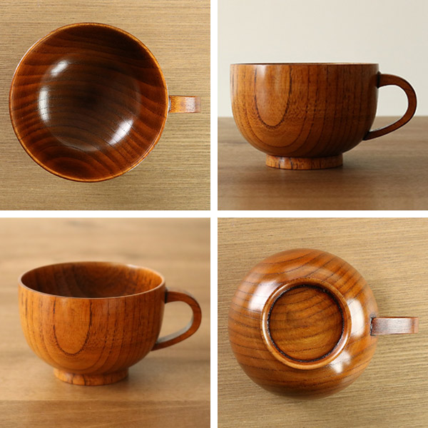 ぬくもりを感じさせる木のスープカップは長く使うほどに手に馴染み、愛着が増してきます。漆塗りが施され、つややかな仕上がりで味わい深く、天然木ならではの年輪の木目・木地の色味・ふし、それぞれの個性をお楽しみ下さい。