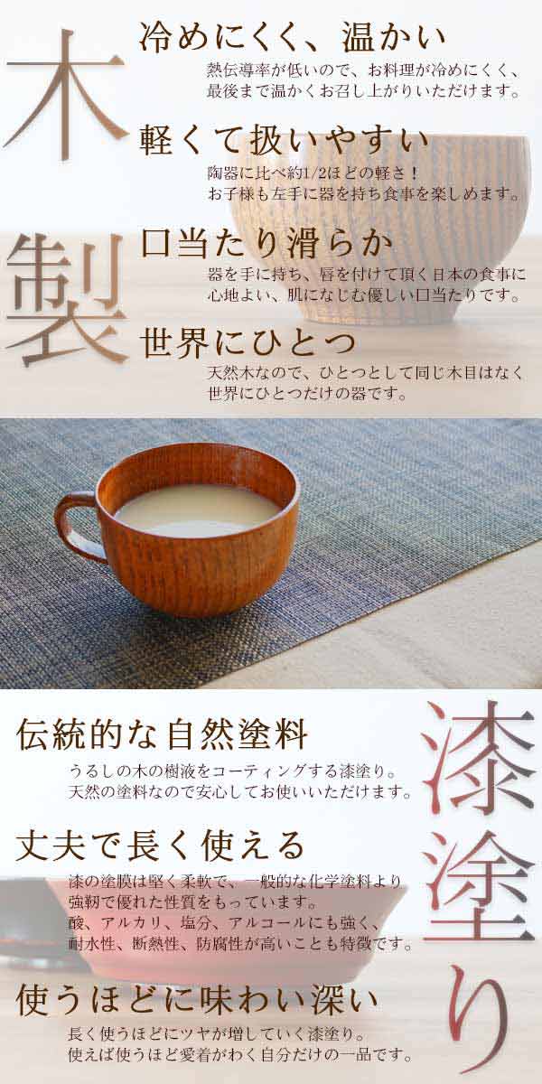 ●木製の器は熱の伝導率が低いので、表面が熱くなりにくく、尚且つ飲み物の温かさをキープしてくれます。
