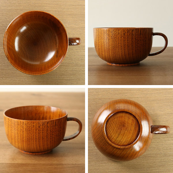 ぬくもりを感じさせる木のスープカップは長く使うほどに手に馴染み、愛着が増してきます。漆塗りが施され、つややかな仕上がりで味わい深く、天然木ならではの年輪の木目・木地の色味・ふし、それぞれの個性をお楽しみ下さい。