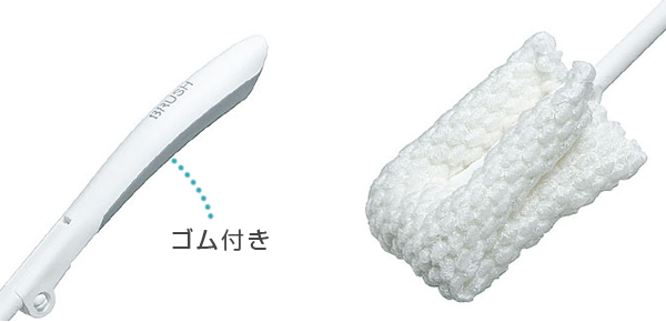 | 握りやすいグリップ グリップはゴム付きで握りやすくなっています。 | 泡立ち抜群モコモコネット 新素材の泡立ち抜群ネットがしっかり汚れをかきとります。 |