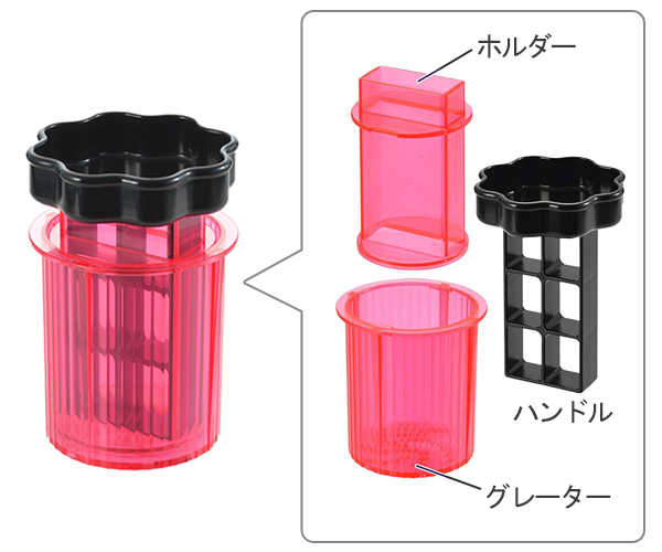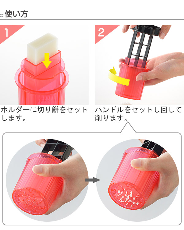 包丁などの刃物を使わずお餅を細かくすることができ、お子様でも安心して使用できます。黒い部分の「ハンドル」と切り餅を入れる「ホルダー」、切り餅を削る「グレーター」で1セットとなっています。