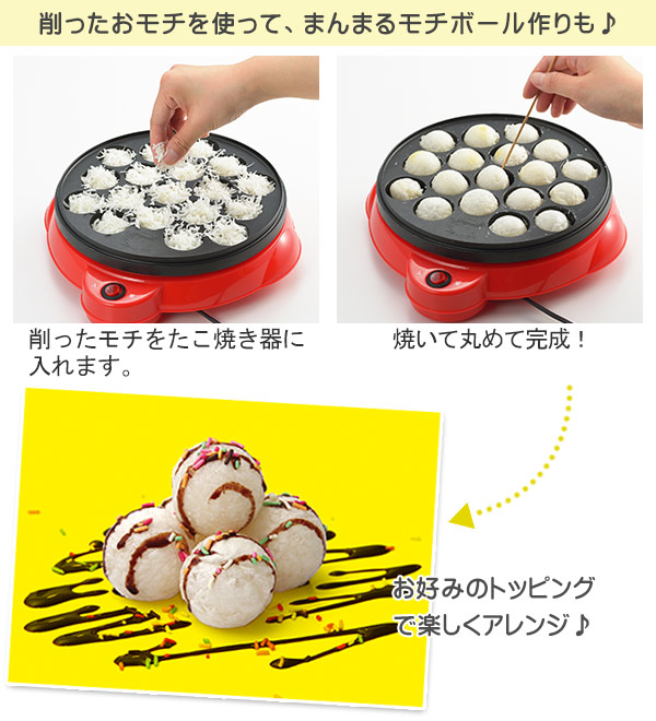 お餅を細かく削ってフレーク状にできる「モチケズ」。削ったお餅をたこ焼き器で焼けば丸いボール状のお餅が作れます。他にも、お好み焼きやチーズオムレツのトッピングにしたり、お米と一緒に炊いておこわ風ご飯にしたりと、お餅の食べ方が広がるアイテムです。みんなでワイワイ楽しみたいシーンにもぴったりです。
