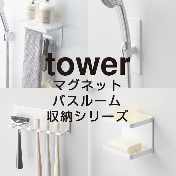 歯ブラシやシェーバーなどの洗面用品を掛けるだけで収納できる歯ブラシホルダーです。毎日使うものだから、使いやすい位置に取り付けることができて便利です。人気の「tower」シリーズはランドリールームを清潔感のある雰囲気に演出し、見せる収納ができます。