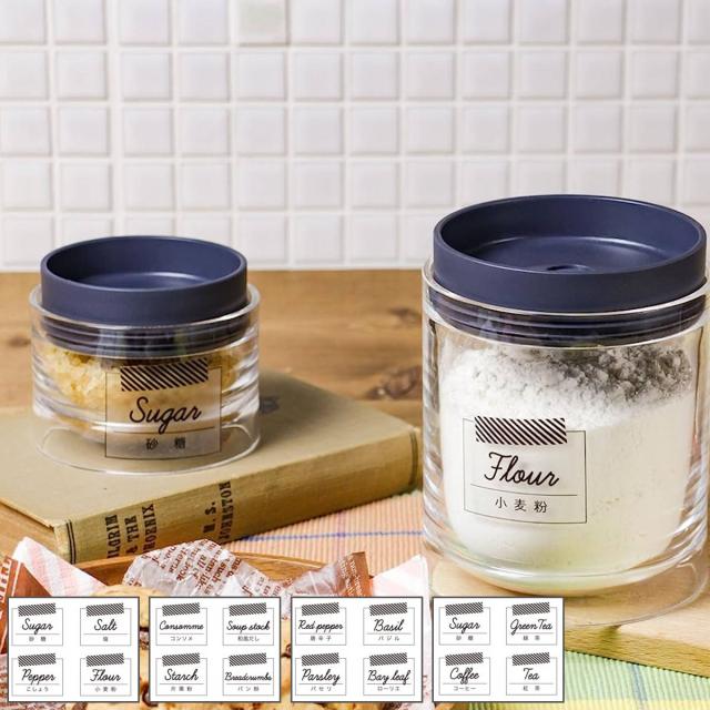 キャニスターやパウダーポットにぴったりのステッカーです。貼ってはがせるので、貼り直しもOK!水にも強く、容器に貼ったまま洗うこともできます。透明の容器にも馴染みやすい透明タイプです。