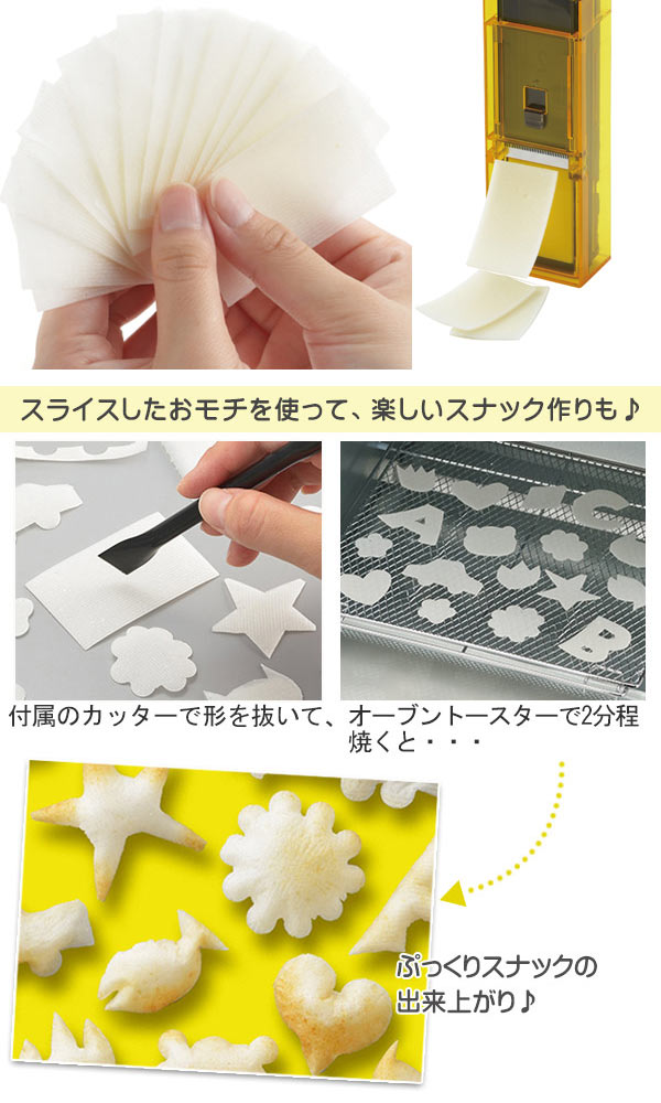 お餅をとっても薄くスライスできる「モチスラ」。スライスしたお餅を付属のカッターで切り取って、スナック作りが楽しめます。他にも、温かいスープやお鍋に入れたり、餅クレープ、おせんべい作りなど、今までにないお餅の楽しみ方ができるアイテムです。