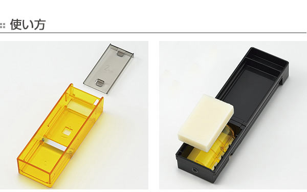 | 1・厚み調節板をセットします。 | 2・ホルダーに切り餅をセットします。 |