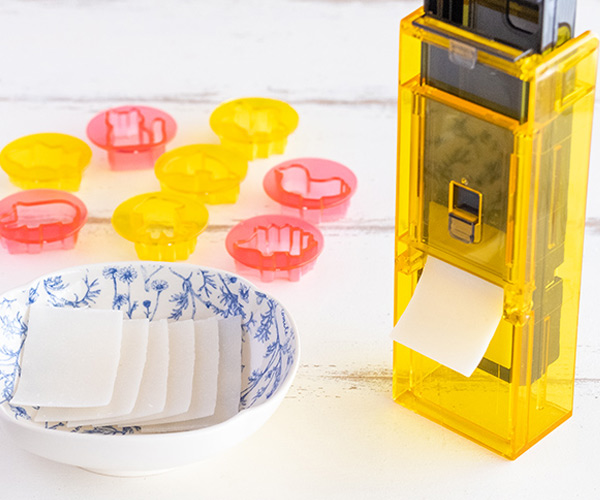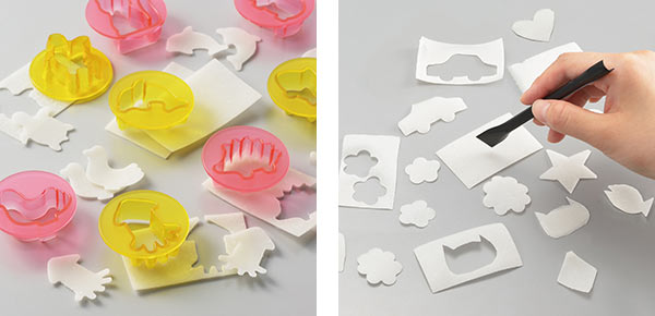 | 5・スライスしたお餅を抜き型で押します。 | 6・付属のカッターで型を抜きます。 |