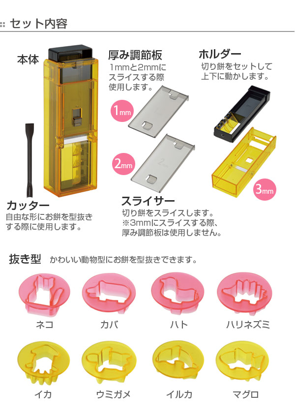 - いろいろあるお餅スライサーの中で、こちらは厚さを変えられるところがいいなと思って購入しましたが、かわいい抜き型が付いていてお得な気分になりました。
