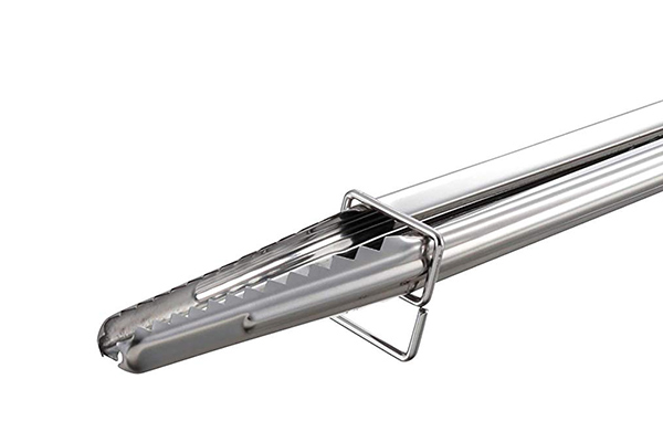 収納ストッパーで固定すると、トングの先端が卓上に付かずに置けます。食材をつかむトングとして、衛生的に使えるのは嬉しいポイントです。