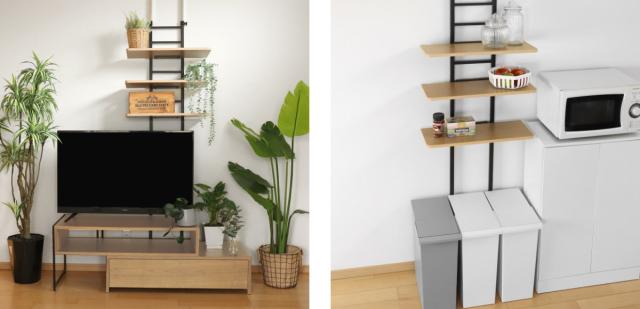 | リビングで テレビボードの後ろに置けば、お洒落なディスプレイスペースに。場所を取らずにインテリアを楽しめます。 | キッチンのデッドスペースに ゴミ箱上のスペースを有効活用できます。よく使う調味料やキッチングッズを置くと便利です。 |