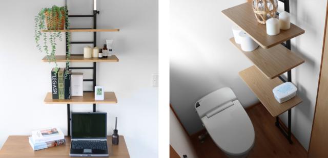| デスク周りの収納に 本や小物を収納していただくことで、デスクの上がスッキリ片付き勉強や仕事もはかどります。 | 狭いトイレに 壁面を利用することで省スペースでも収納を可能にします。トイレ用品のストックや、芳香剤や小物のディスプレイにも使えます。 |