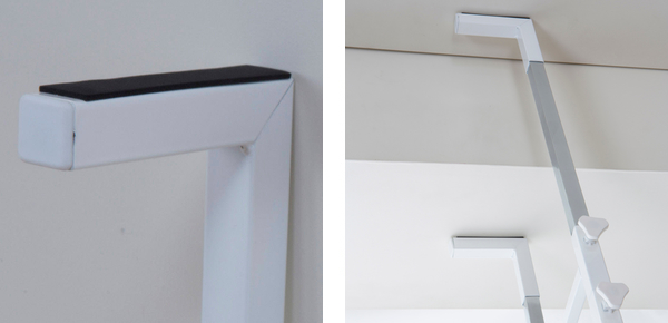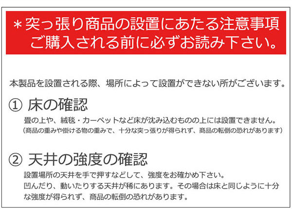 | クッション付き 天井を傷つけにくいフェルト素材のクッション付きです。 | 梁のある天井にも設置OK 片方ずつ別々に長さの調節ができるので、梁のある天井でも設置可能です。 |