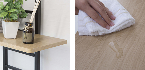 | 角が丸くて安全 棚板の角は安全のため、角を丸くする加工が施されています。 ※画像の一部に角が角ばっているものがありますが、実際にお届けする商品は角が丸くなっています。 | 水や汚れに強い 棚板はPVC(塩化ビニル)加工、フレームには粉体塗装を施しているので、汚れにくく、水に濡れてもサッとふき取ることができます。 |