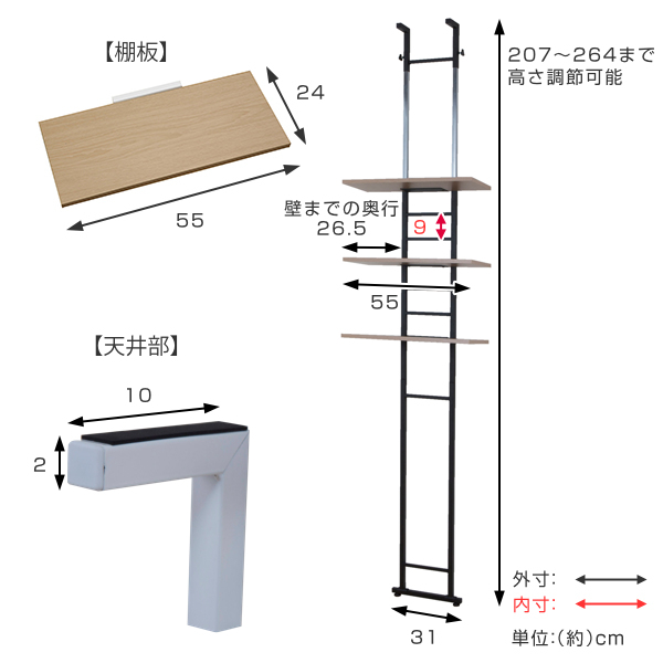 | サイズ | 約 幅55×奥行26.5×高さ207〜264(cm) 棚板:1枚あたり約 幅55×奥行24(cm) |