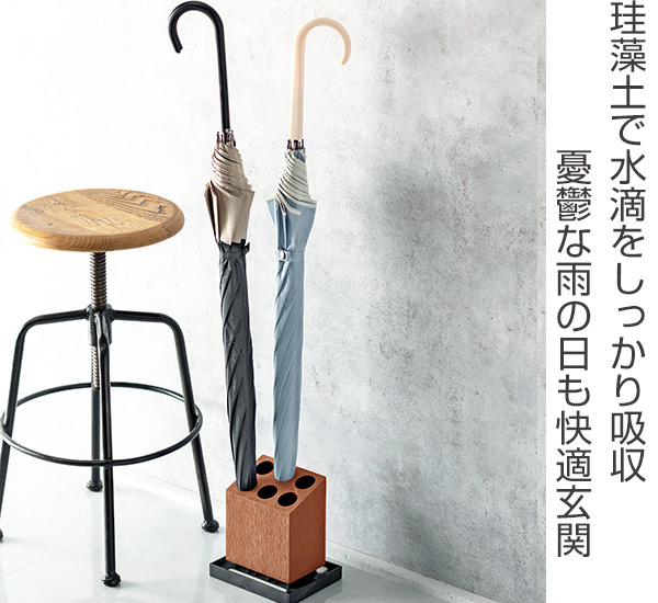 とてもコンパクトで玄関に気軽に置けます。傘を立掛け無い日は靴箱などに片付けられます。コンパクトですが、超吸水型珪藻土バーで水滴をしっかり吸水します。