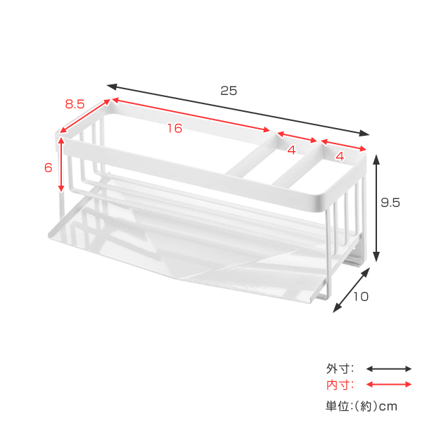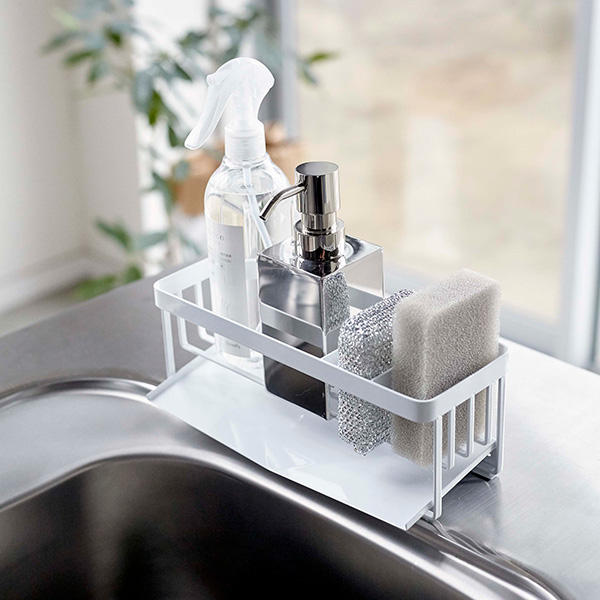 幅違いの3つに仕切られているので、ごちゃつかずに洗剤ボトル2個分とスポンジ2個を収納できます。シンプルなフレーム構造と立てて収納することで水キレが良く清潔に保つことができます。