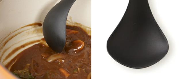 お玉部分はお鍋の底にちょうど沿うようなひし形の形状なので、お鍋の底に残ったカレーやシチューも、きれいに残さずすくうことができます。左右対称の注ぎ口なので、右利き左利きどちらの方にも使いやすいです。